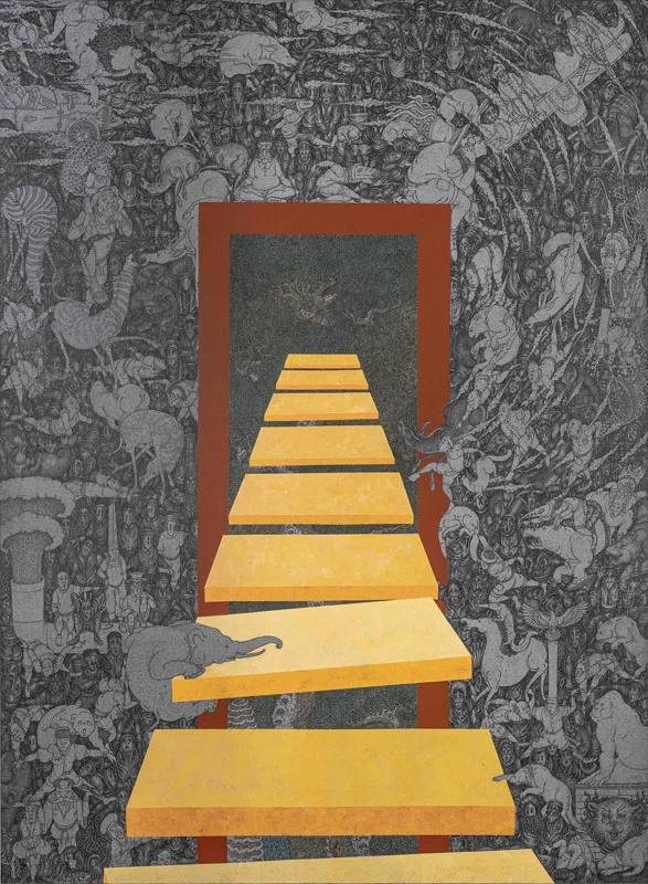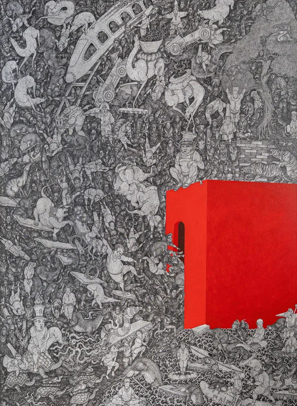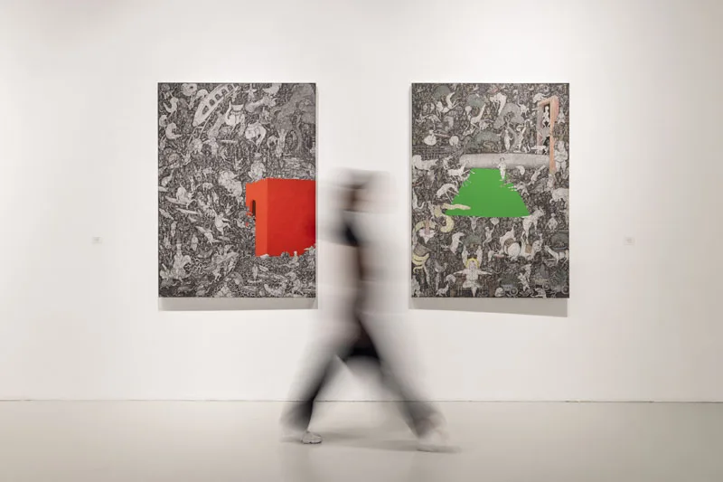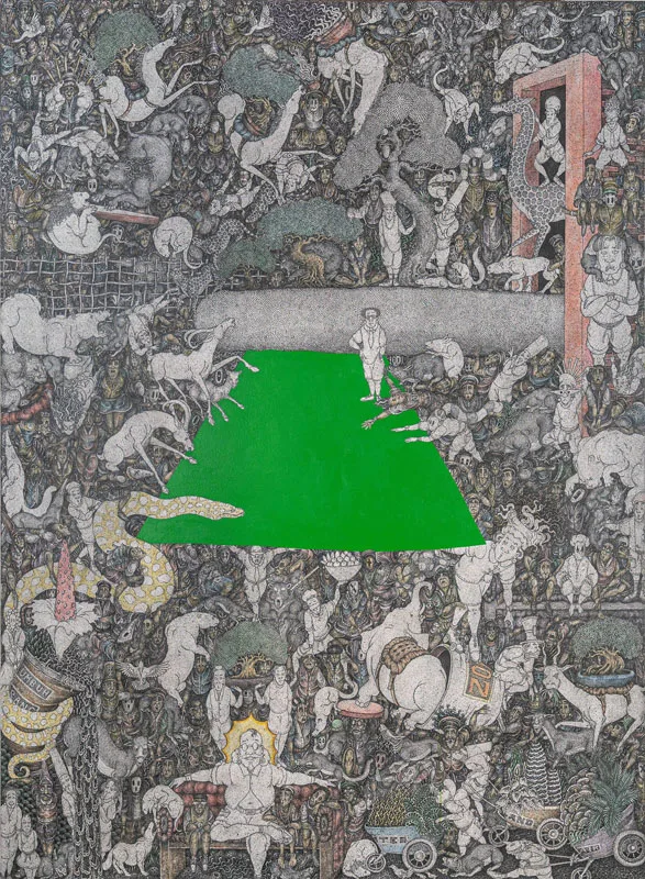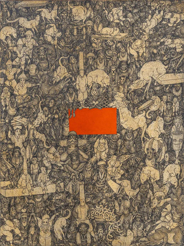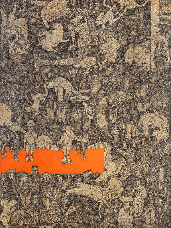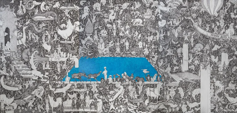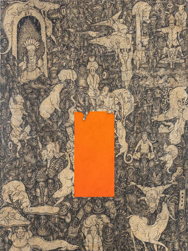 Bali has long been a place of negotiation between tradition and modernity. Since the 1930s, when European artists Rudolf Bonnet and Walter Spies introduced Western techniques through Pitamaha artist collective, which maintained the quality of Balinese art, evolving without losing its essence. Growing up in a family of artists, Arisana continues this trajectory, employing intricate methods such as sigar mangsi shading and bamboo brushwork on dense compositions of the traditional Batuan style, while introducing voids, vibrant colours, and unconventional placements that make his works unmistakably contemporary.