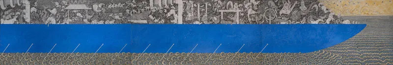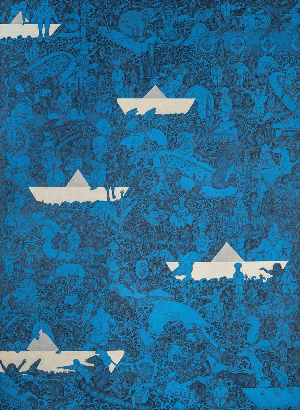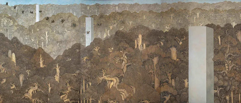Arisana’s works finds mediation on cultural loss, commodification, and ecological strain felt in his immediate surroundings. His paintings critique the growing deviation from Tri Hita Karana, the Balinese Hindu principle of harmony between human, their god, and their surrounding nature. Konversi (Conversion) shows concrete pillars rising in forest greenery, while Tentang Air (About Water) recalls a once-vital river now polluted. His largest work, Mencari Tempat Baru (Searching for a New Place), imagines an ark filled with flora and fauna seeking refuge; a vision of nature’s fragile survival amidst unchecked development.