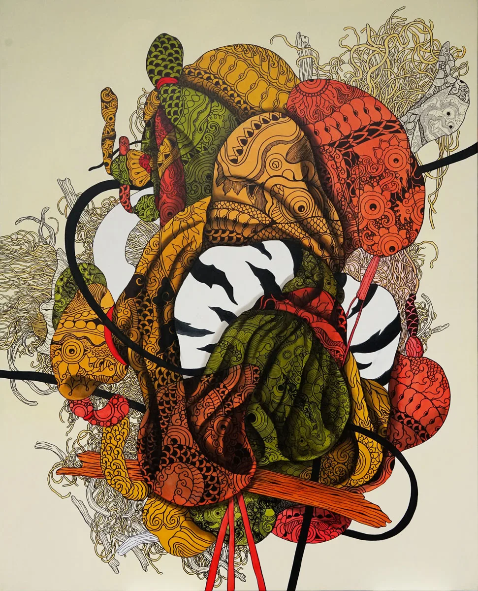 Mizuma Gallery is proud to present Liminal Relic, solo exhibition by Kemalezedine, curated by Asmudjo J. Irianto, opening on 17 January 2026. The exhibition explores the evolving space between tradition and modernity in contemporary Balinese art. Drawing from Balinese cultural objects such as Kamasan paintings, ceremonial ornaments, and symbolic motifs, the artist reflects on how these traditions continue to exist— no longer in their original form, yet not fully lost. Kemalezedine repositions these relics not simply as remnants of the past, but as living forms open to reinterpretation. His works are fragmented and layered, echoing the way traditions are constantly negotiated and reshaped in the present. Liminal Relics questions how cultural symbols function today, especially when Balinese people live between communal ritual practices and individual modern lives. Through this exhibition, Kemalezedine reimagines Balinese painting as a critical, contemporary visual language.